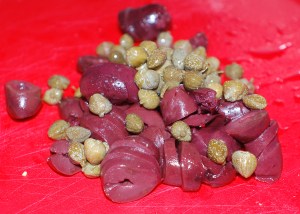 - 8-10 olives, chopped if pitted; kalamatas work great