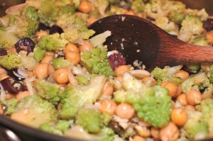 Once the broccoli is done, add in the capers, olives, and chickpeas. Add more olive oil if needed. Cook pasta to the al dente stage, reserve about 1/4 cup of pasta water, drain the rest and add pasta to the saute pan with the vegetables. Add pasta water a little at a time, toss all the ingredients well, and cook for another 3-4 minutes. Salt and pepper to taste. I personally love to throw in red chile flakes at this point too, depending on heat preference.